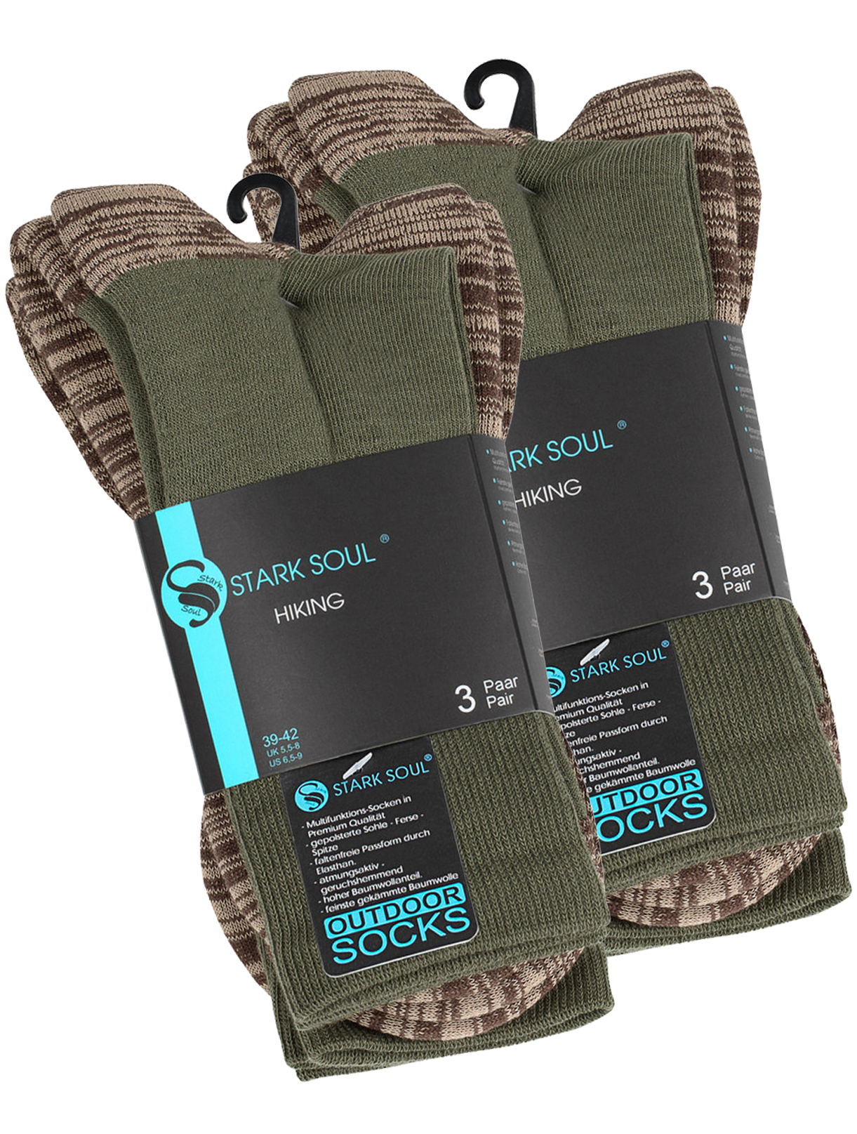 2 Paar STARK SOUL® Unisex Trekking Outdoor Socken Ob beim Wandern, Trekking oder Laufen weiter Strecken, die Outdoor-Socken von STARK SOUL® sind ein wahrlich idealer und komfortabler Begleiter auf hartem Untergrund. Polsterungen an Ferse, Zehen, Fußsohle, Knöchel und Achillessehne Verstärkte Frottee-Sohle sorgt für weichen Tritt und gute Dämpfung Anatomisch geformtes Fußbett Atmungsaktiv und Klimatisierend durch das integrierte Kanal-Lüftungssystem in der Fußsohle Mit praktischer Rechts/Links-Funktion Komfortbund sorgt für einen guten Sitz und bequemen Halt ohne zu verrutschen Eingestickte Größenangabe zur besseren Sortierung perfekte Wandersocke Geprüfte Qualität durch das Deutsche Institut für Verbraucherschutz Rechts/Links-Kennzeichnung Praktische Größenangabe Komfortbund und Spitzennaht Polster und Lüftungsystem