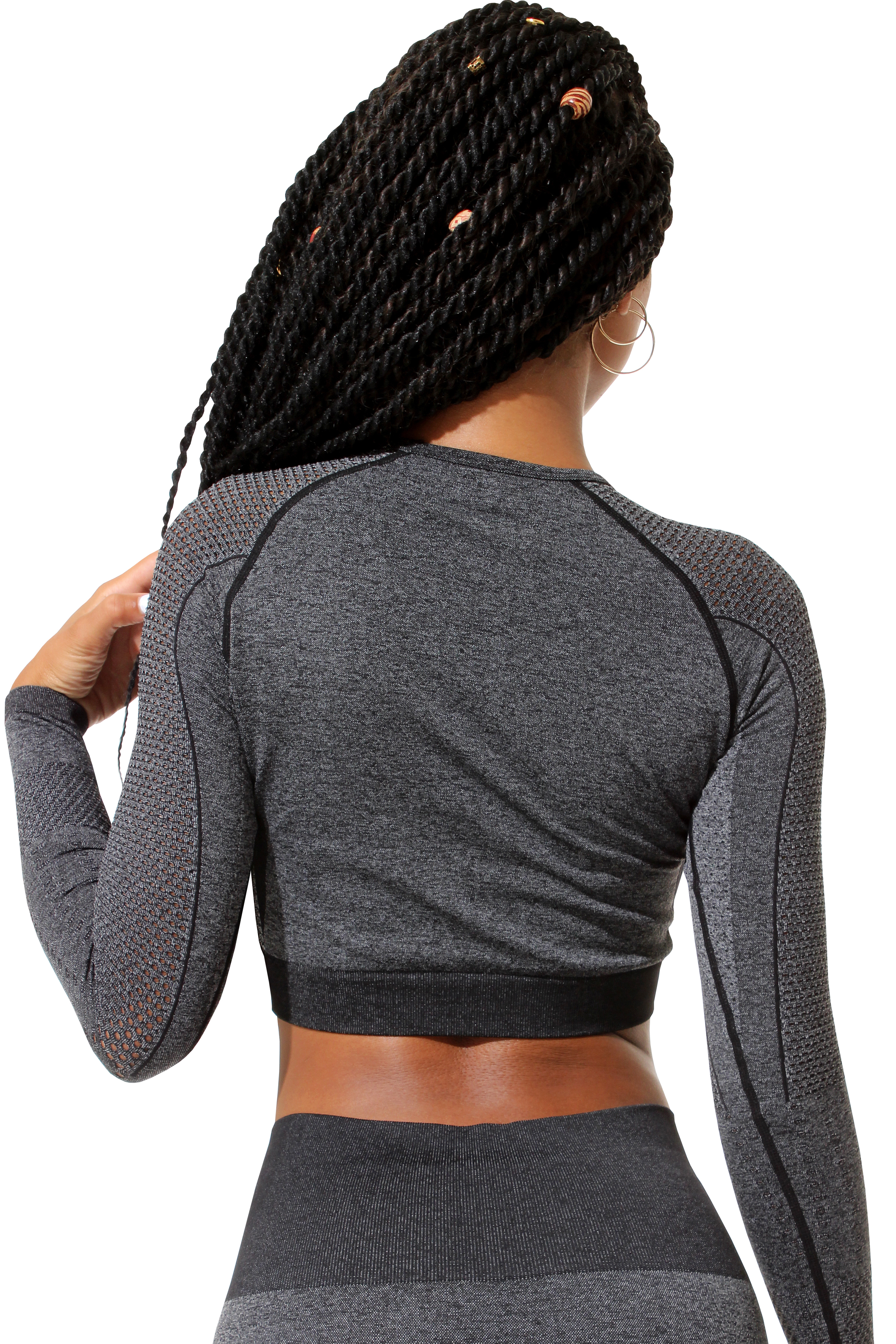 Das Crop-Top in schmucker Melange-Optik hat einen Rundhalsausschnitt und lange Ärmel. Das breite Bündchen am Saum sorgt für perfekten Halt.