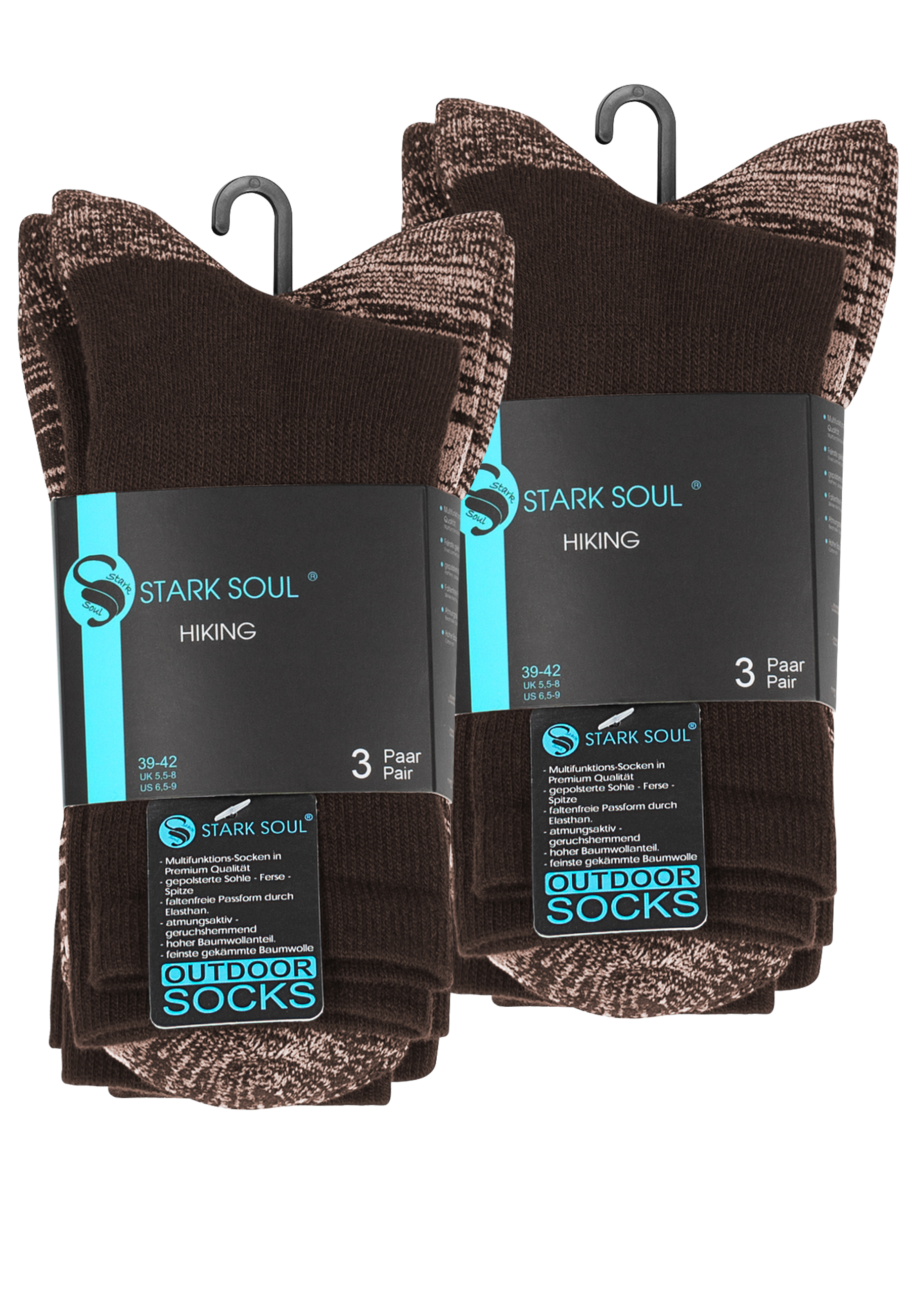 2 pairs of STARK SOUL® unisex trekking outdoor socksWhether hiking, trekking or running long distances, the outdoor socks from STARK SOUL® are a truly ideal and comfortable companion on hard surfaces.Padding on the heel, toes, sole of the foot, ankle and Achilles tendon Reinforced terrycloth sole ensures a soft step and good cushioning Anatomically shaped footbed Breathable and air-conditioning thanks to the integrated channel ventilation system in the sole of the foot With practical right/left function Comfort waistband ensures a good fit and comfortable hold without slipping Embroidered size information for better sorting Perfect hiking sockTested quality by Deutsches Institut für Verbraucherschutz